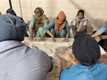 Volunteers roll out rotis, Sikh temple